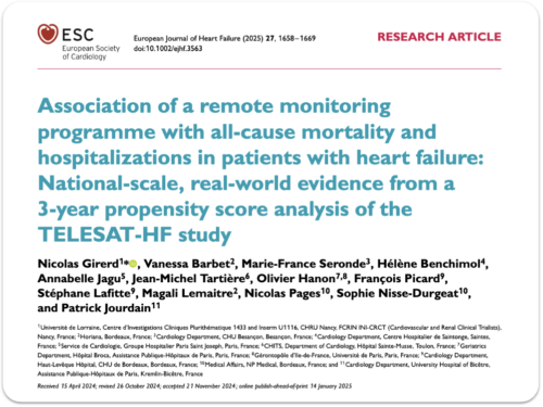 Les recommandations ESC 2021 précisent que la télésurveillance peut être recommandée lorsqu’elle améliore les résultats cliniques des patients insuffisants cardiaques (McDonagh TA et al., European Heart Journal, 2021;42:3599-3726). L’étude nationale TELESAT-HF, publiée dans le European Journal of Heart Failure en 2024 (Girerd N. et al., doi:10.1002/ejhf.3563), rapporte :